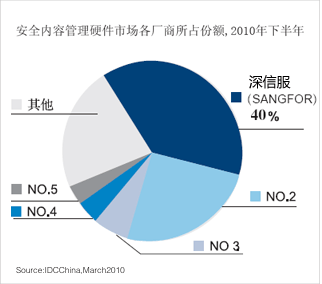 深信服科技在IDC中國發(fā)布的2009年下半年中國安全內(nèi)容管理市場(上網(wǎng)行為管理市場)報告中占有率達到33.8%,超出第二位廠商達一倍多。
